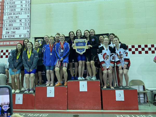 To finish off the night for the girls, we got to watch an impressive 200 freestyle relay race. The team that took gold was Nazareth in a time of 1:37.17, consisting of Kinglsey, Spengler, Palochick, and junior Cameron Alvino. Southern Lehigh finished in second. Emmaus touched in third. And Parkland came in fourth.