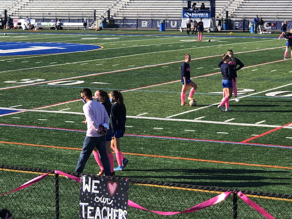 On Wednesday October 14th, the Nazareth Girls Soccer team brought in the win against Northampton as they celebrated teacher appreciation night. The first half was pretty evenly matched as the ball flew up and down the field, neither team giving up a goal. With 20 minutes left in the first half, there was a close call as Northampton took a powerful shot on goal. Luckily for Nazareth, defender Skylar Jordan narrowly blocked the ball, sending the shot soaring over the keeper’s head and the goal.