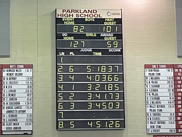 Parkland’s senior night on Tuesday marked the eighth dual meet of the season. The Lady Trojans advanced to 7-1 after their win over Liberty 127-59. The boys lost to Liberty 101-82 falling to 4-4 on the season. We would like to congratulate our Parkland seniors, Kayla Johnson, Harrison Kim, Ethan Radio, Hillary Roth, Izzy Sheridan, Nicole Stofko, Claire Weaver, Leah Webb, Luke Willard, and Nick Zaffiro on their terrific careers and wish them the best of luck in their bright futures.