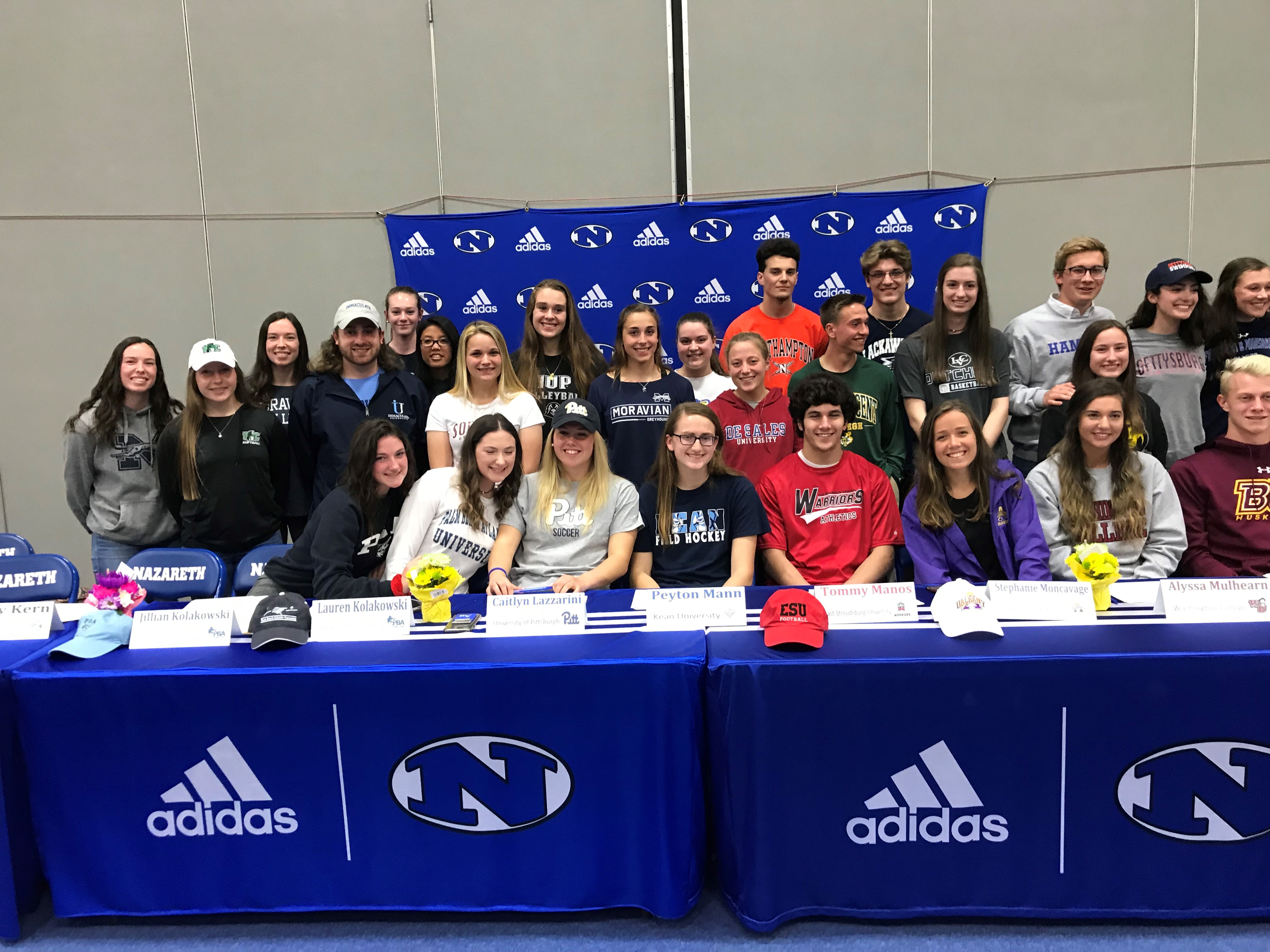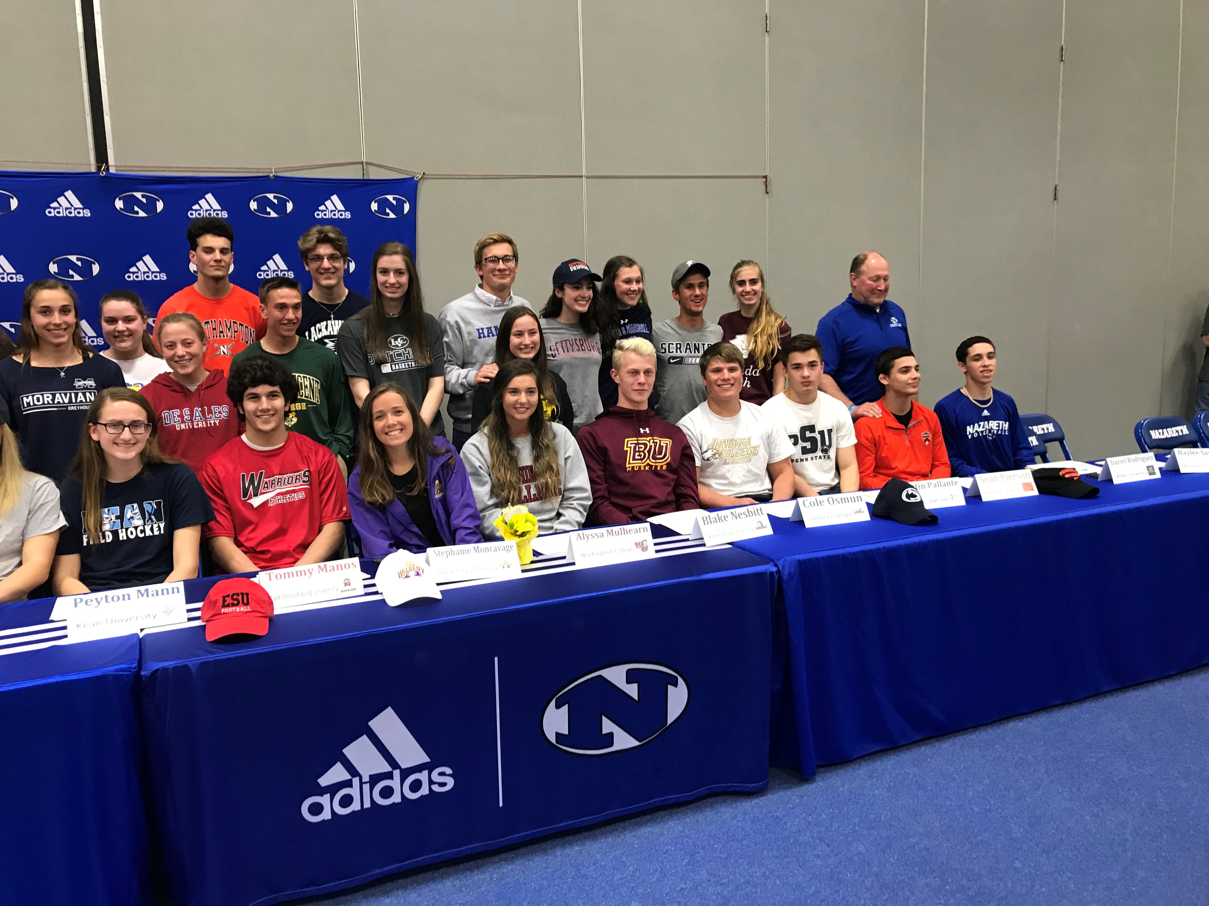 It was a day to remember at Nazareth High School as 34 student-athletes came together for a Signing Day Ceremony. Sixteen Sports were represented with some athletes staying close to home while others chose a further distance as their college choice. Today’s ceremony took place in Raymond J. Nunamaker Gymnasium.