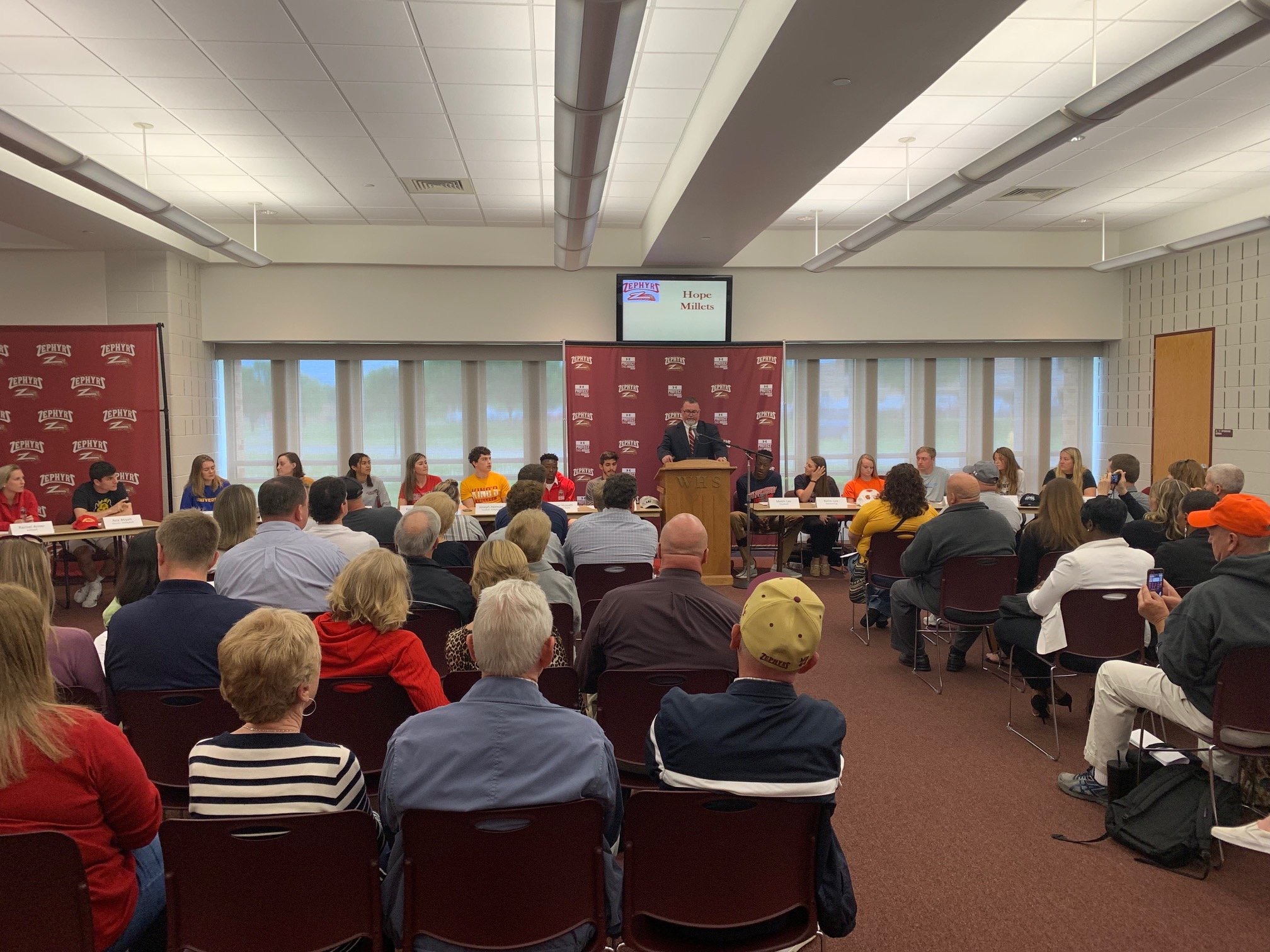 More than twenty students were on hand representing 15 different sports programs. Four student-athletes will continue participating in Soccer and Swimming while three will move on to play Football with a host of others taking part in many other sports.